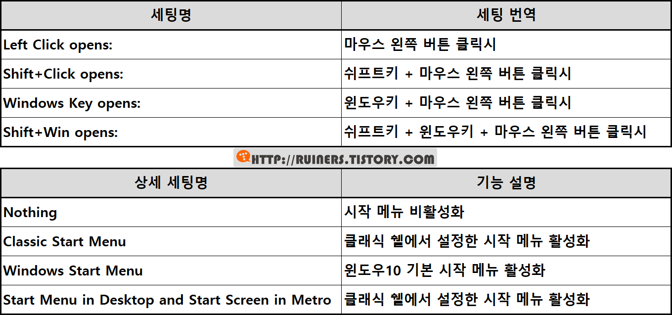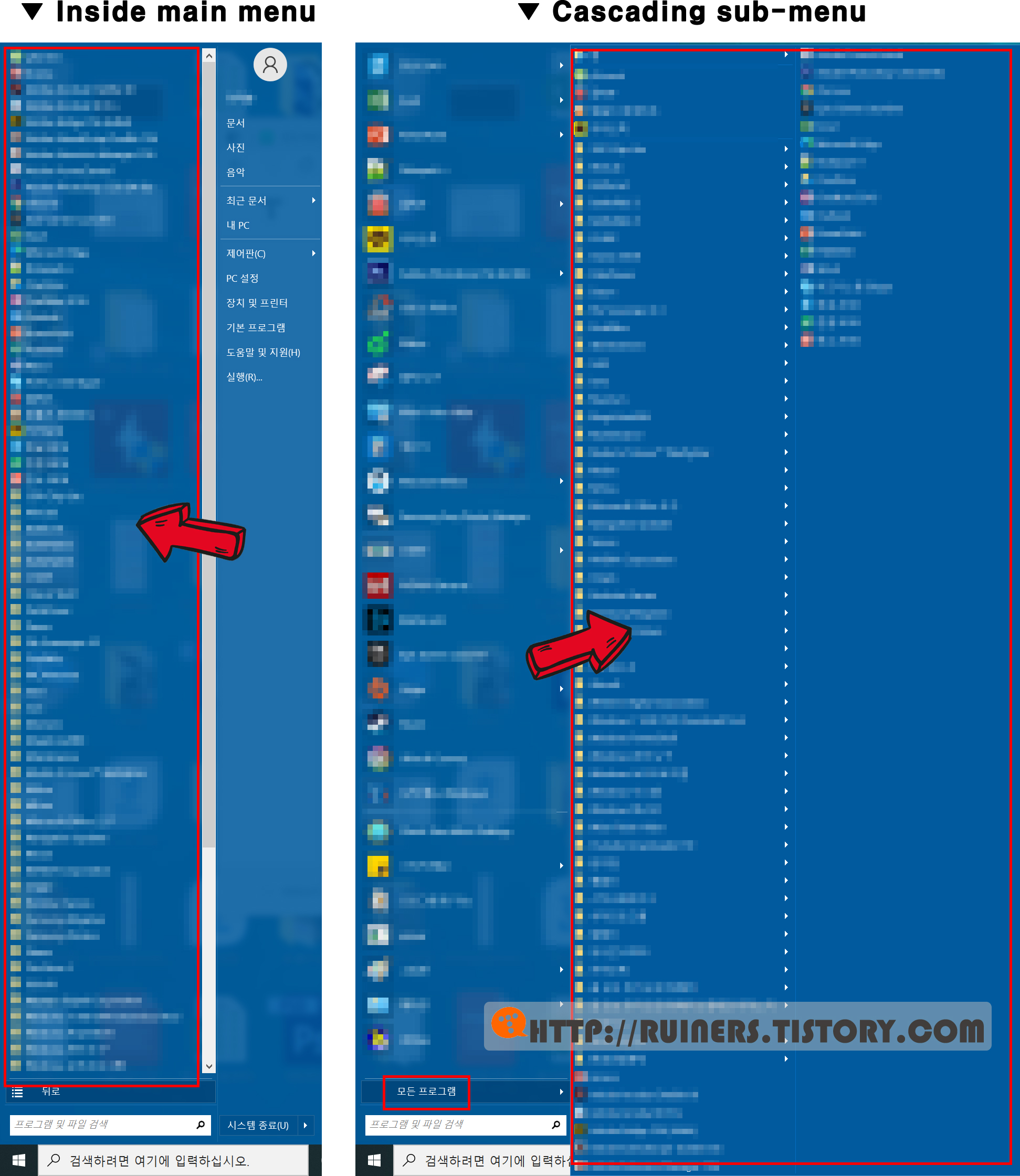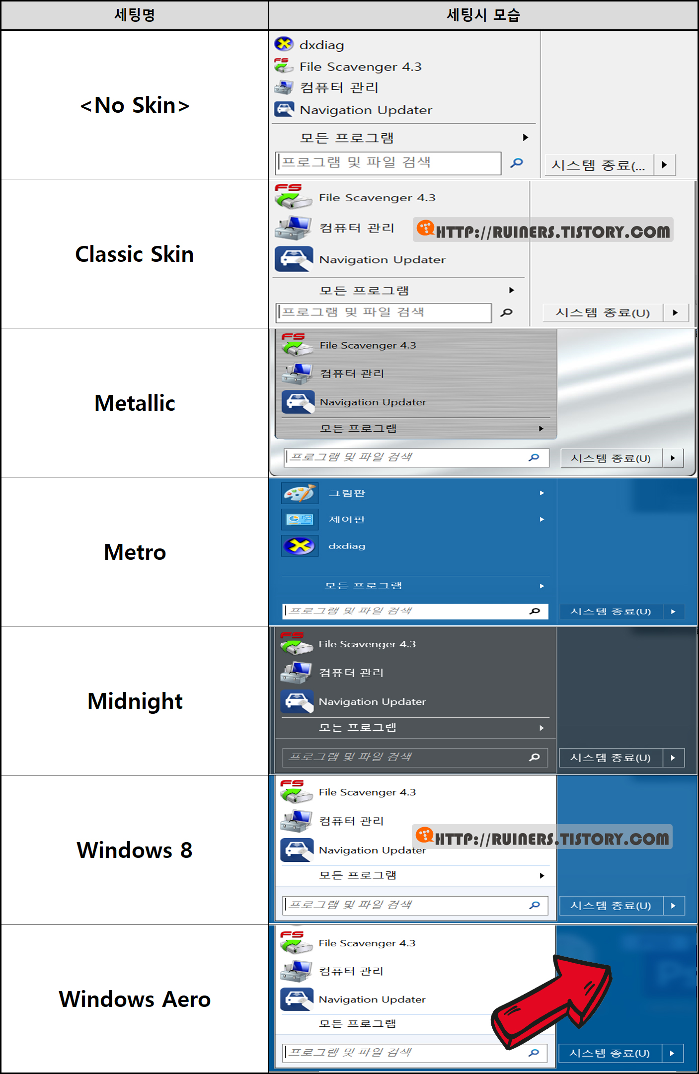 단순하기 때문에 아래 스타일별 시작 메뉴 사진을 참조하시기 바랍니다.