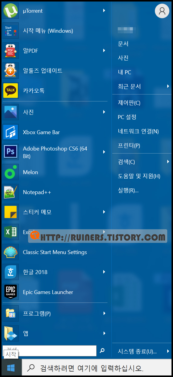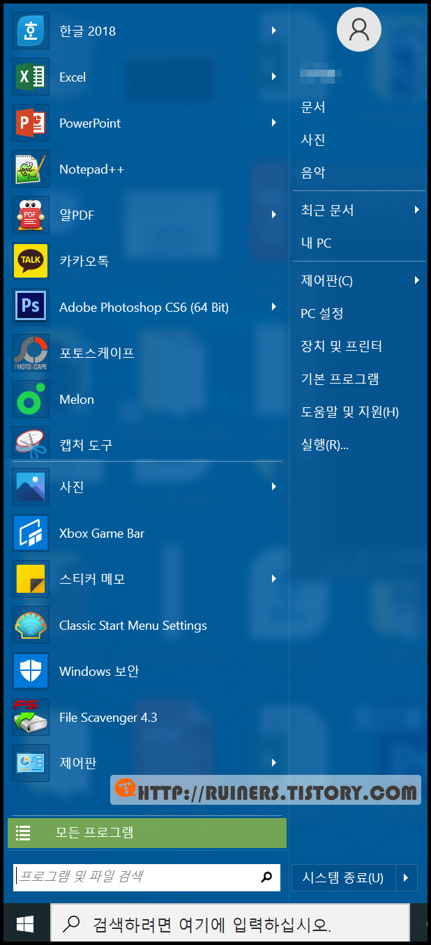 윈도우 10 시작 메뉴 → 윈도우 7 처럼 바꿔 사용하기