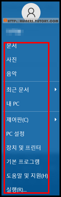 시작 메뉴 좌측의 보여지는 화면을 편집하는 설정입니다.