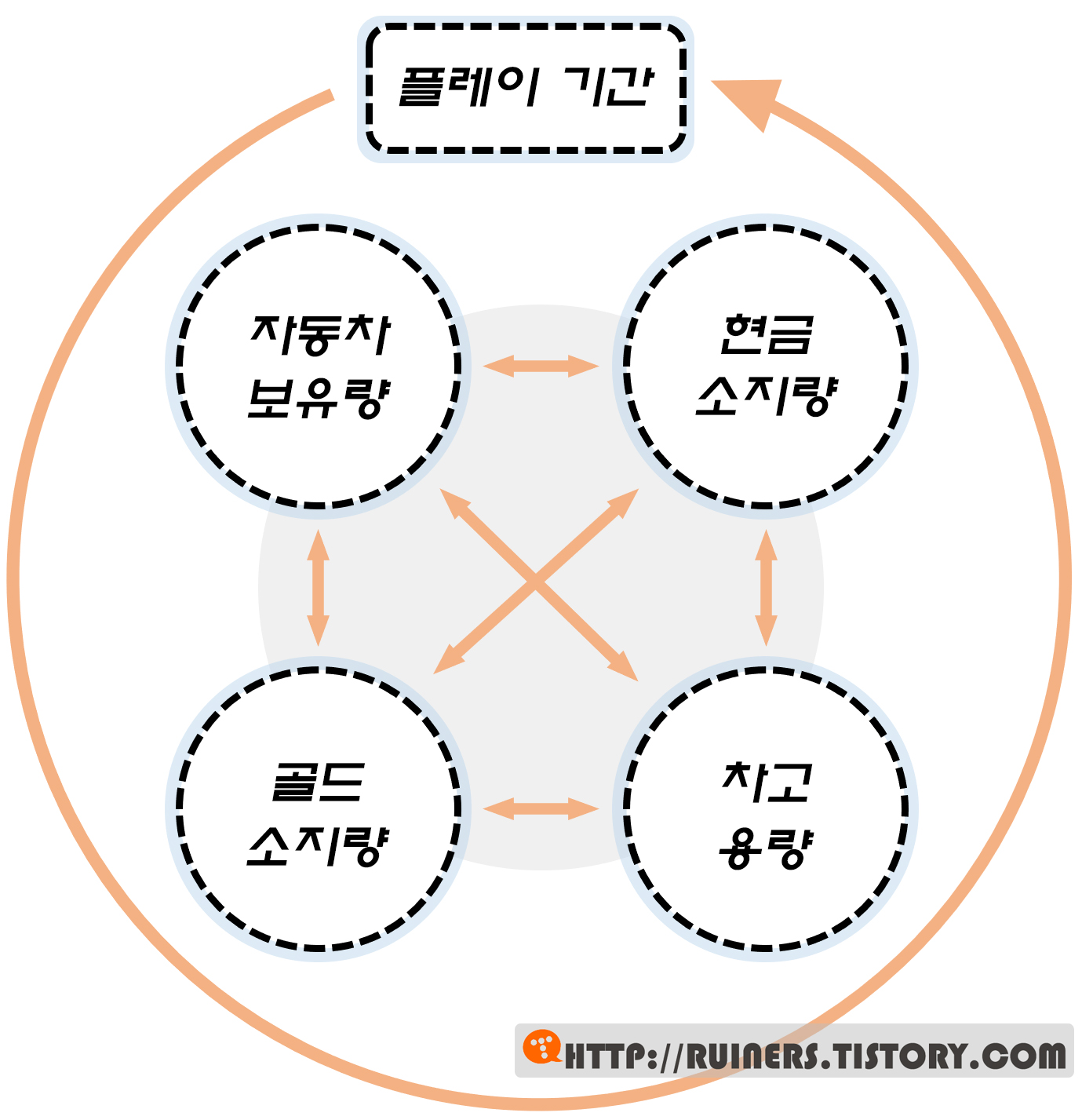 ▶ 자동차 보유량 ▲ / 차고 용량 ▲ / 현금 소지량 ▼ / 골드 소지량 ▲