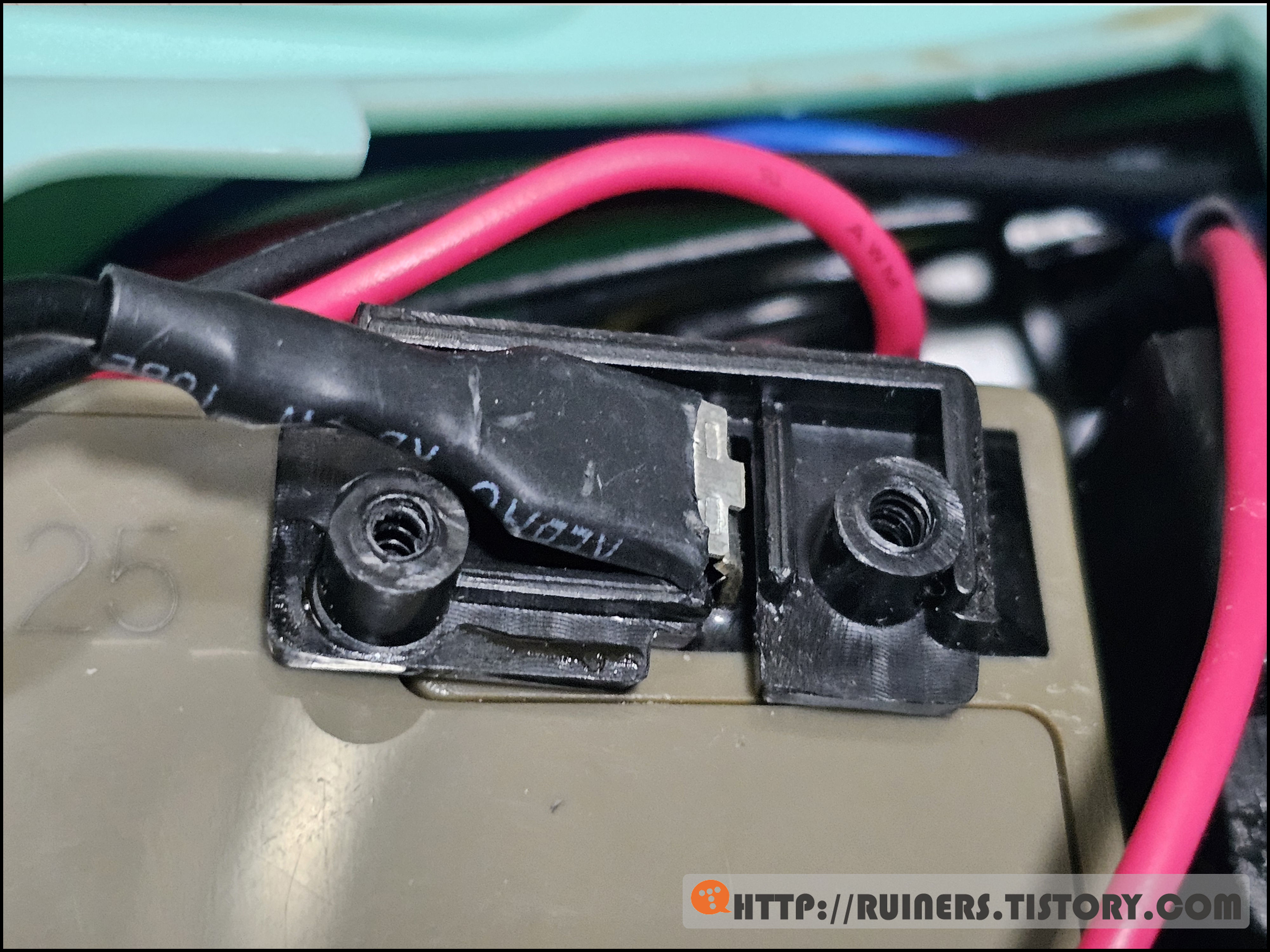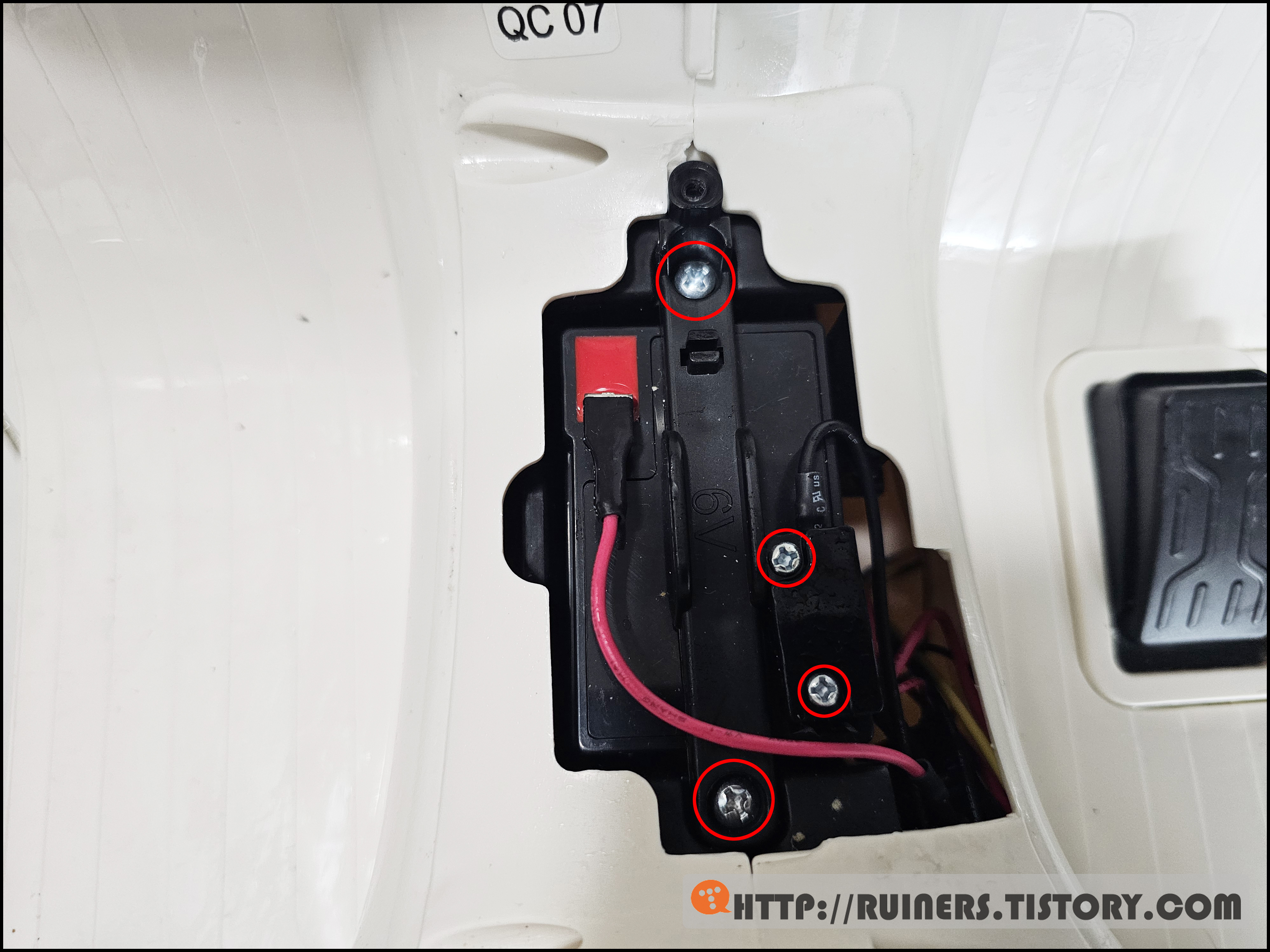 ② (-)극 이탈 방지 부품 제거 (제거시 연결된 선을 살짝 들어 공간 만들어서 제거 필요. 사진참조!)