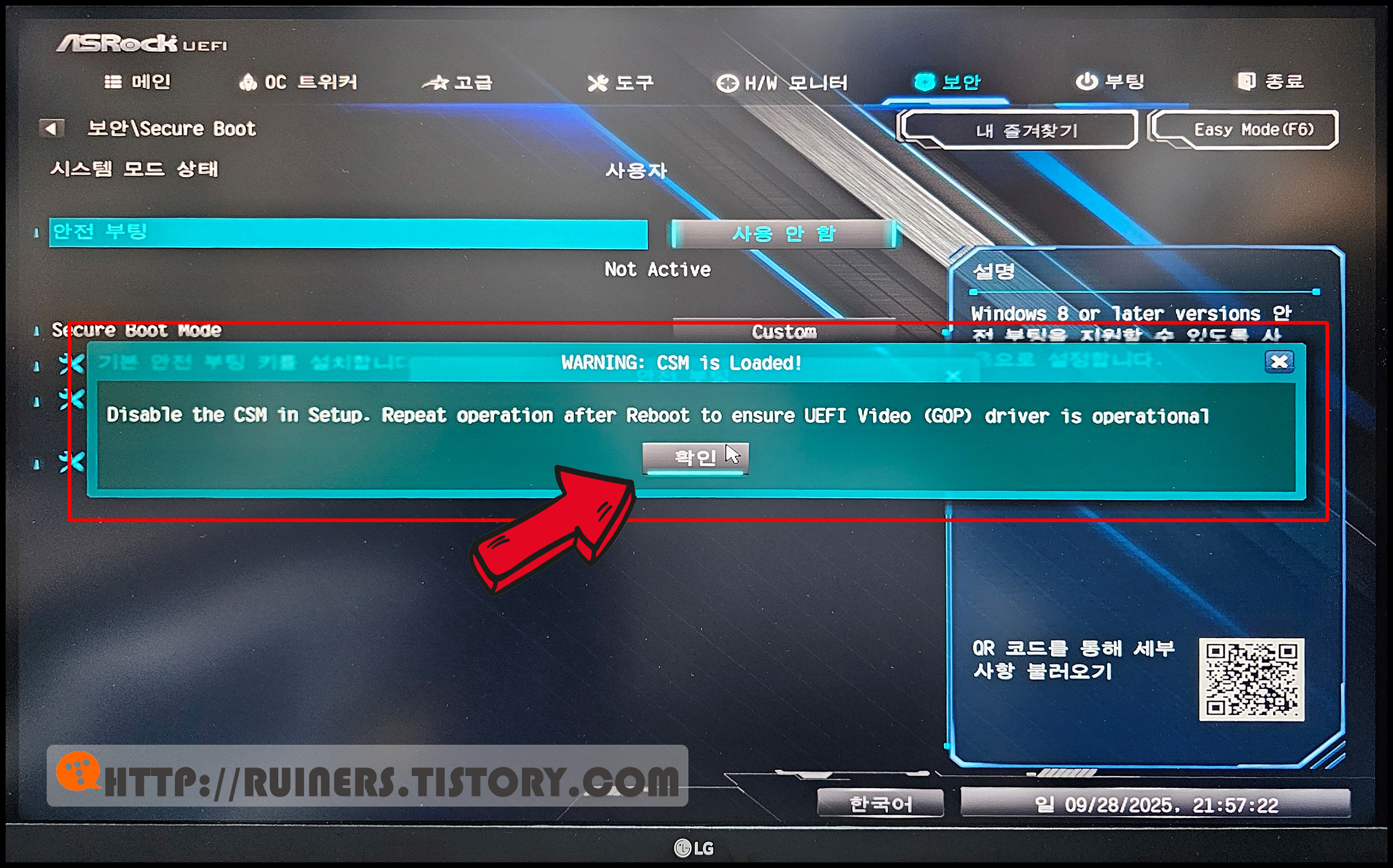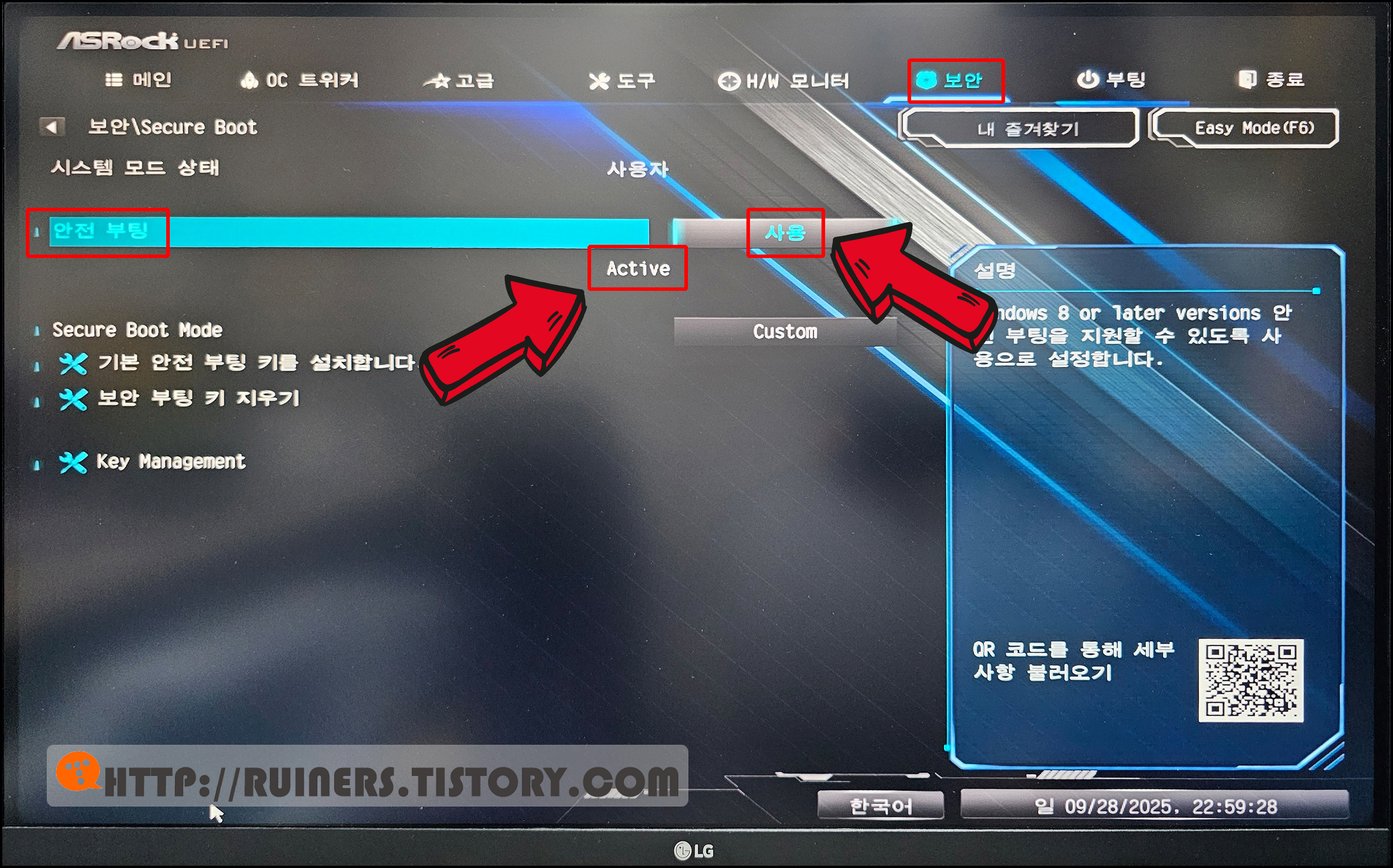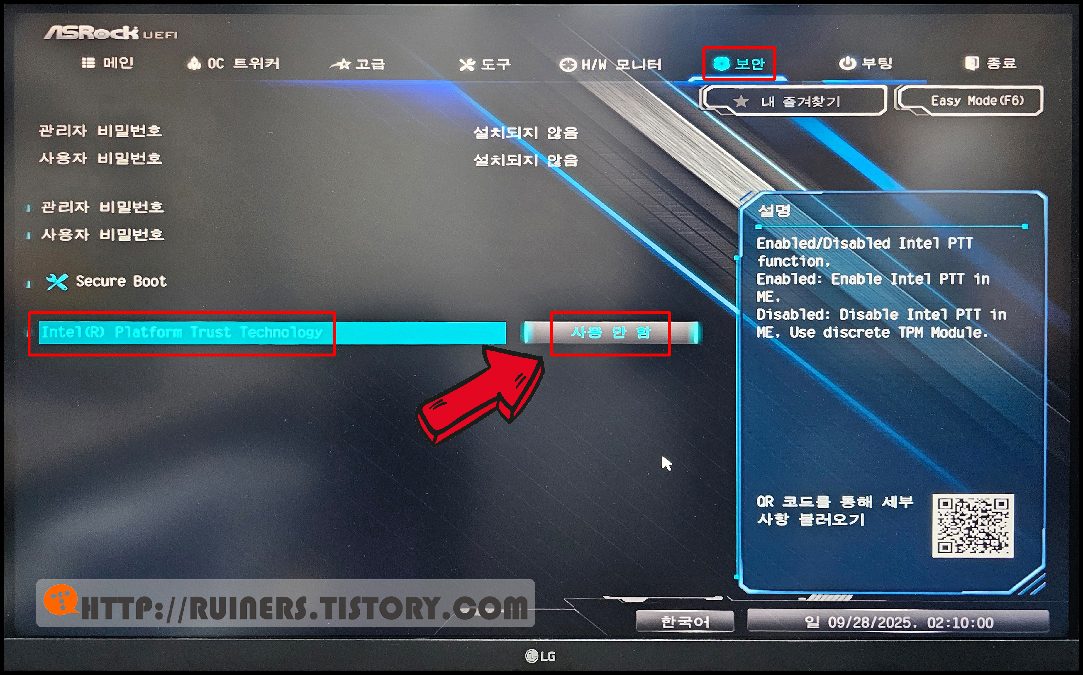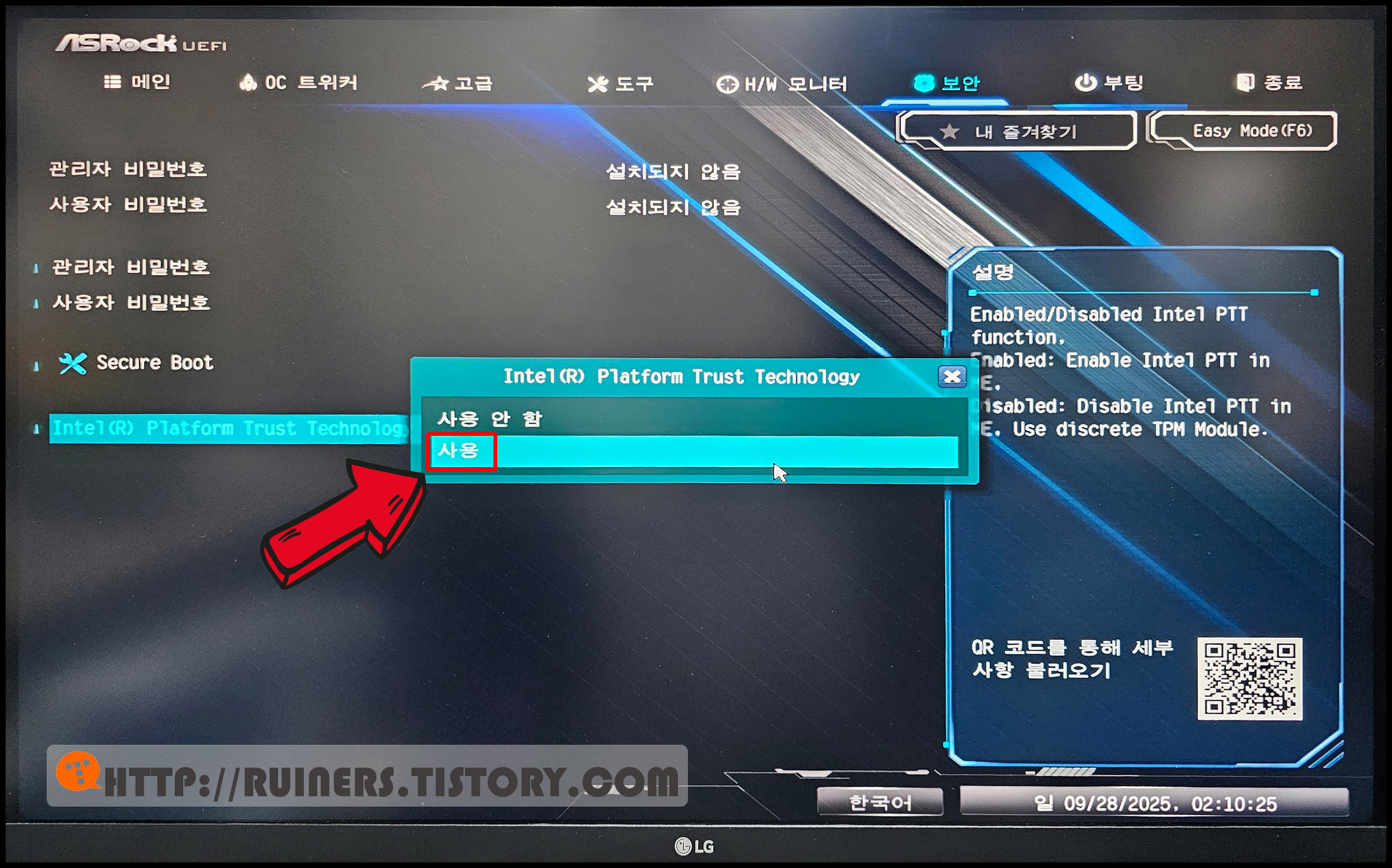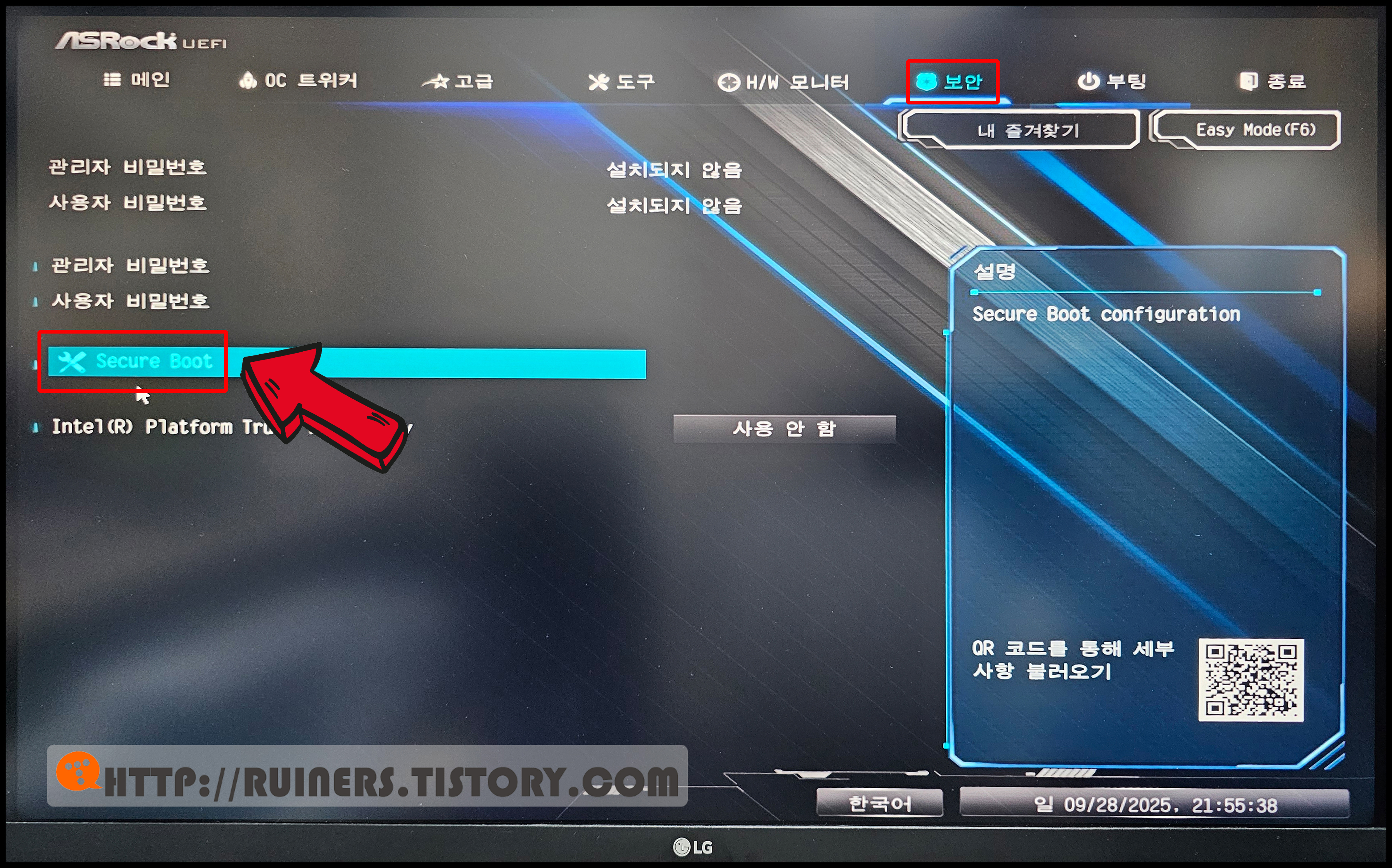 ② Bios 에서 "TPM 2.0 + 안전 부팅 설정" 진행