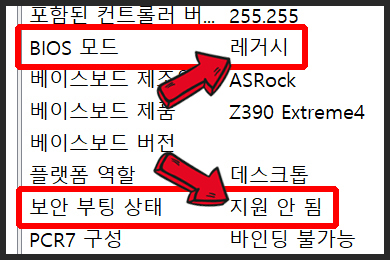 제 경우, "Bios 모드 = 레거시" / "보안 부팅 상태 = 지원 안 됨" 상태 였습니다.