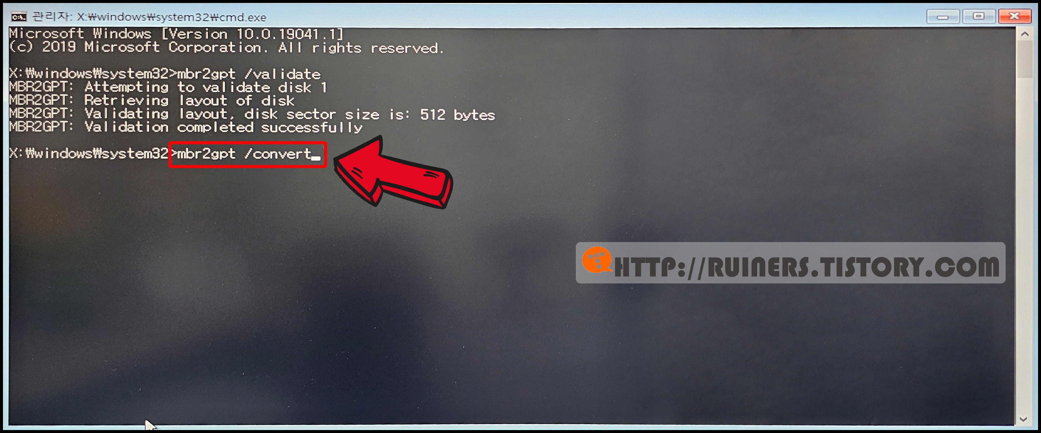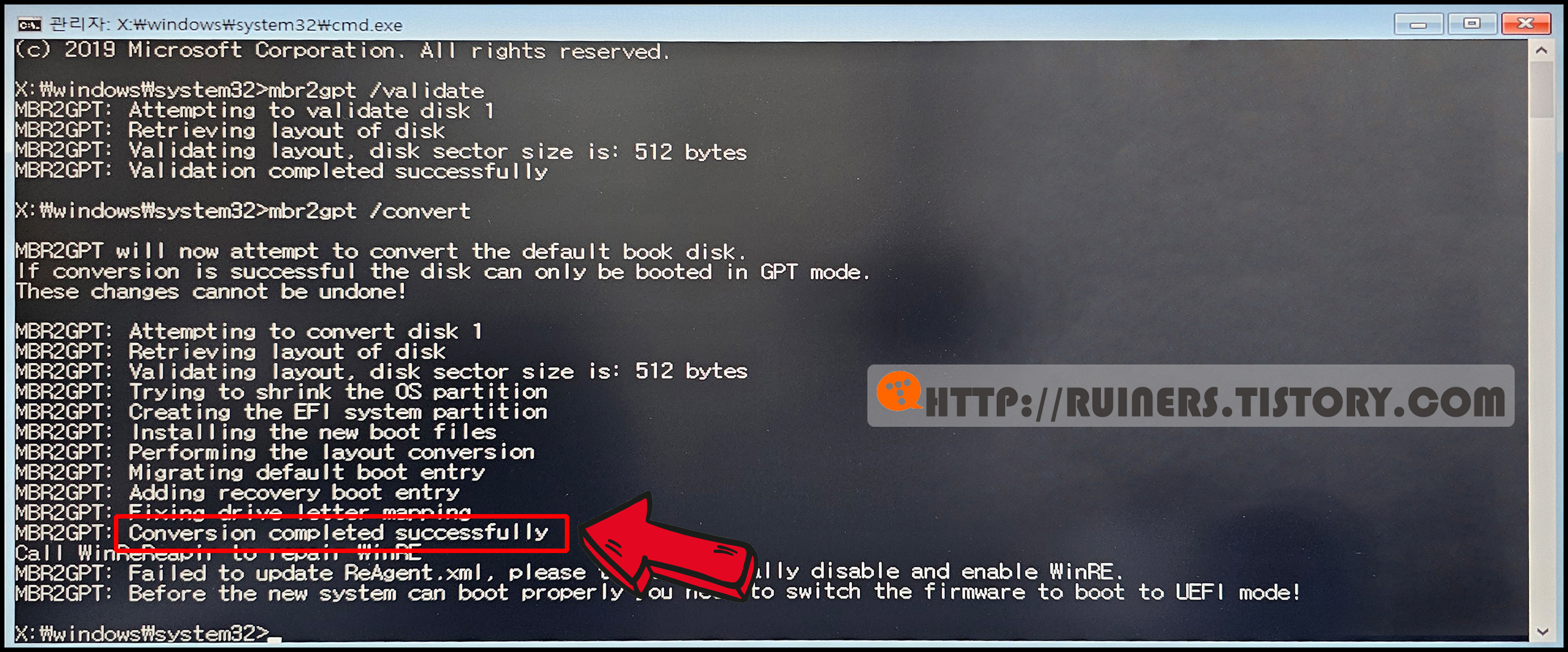 2) mbr2gpt /convert 입력 → Convert completed successfully 문구 확인