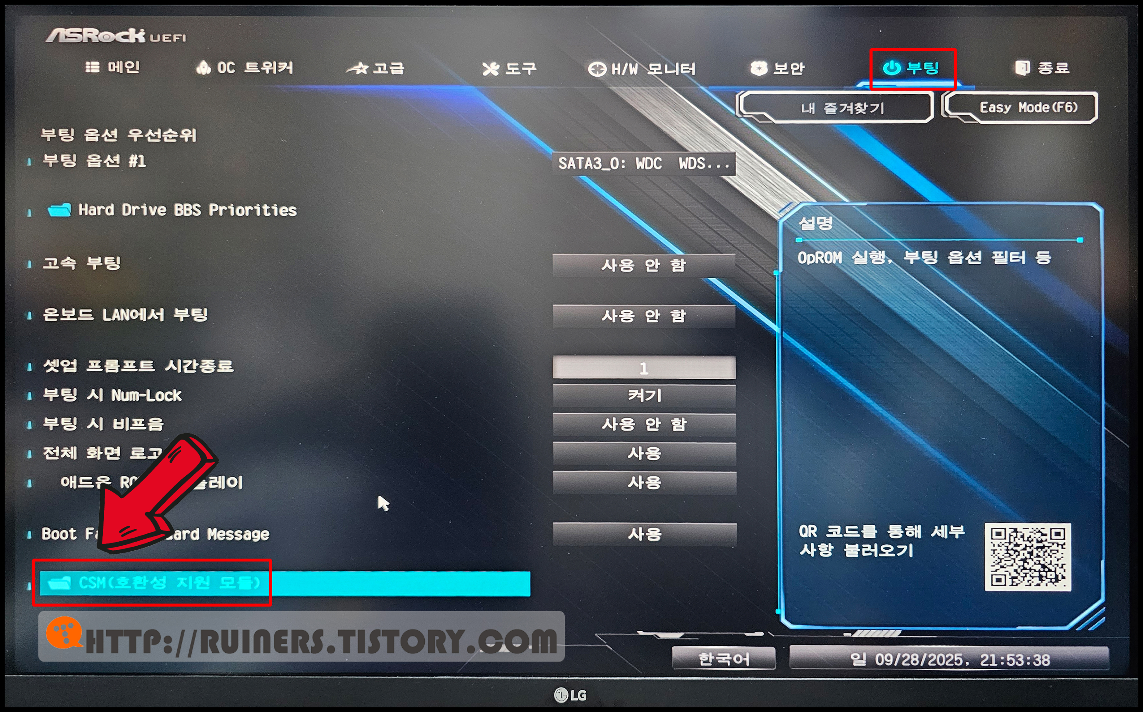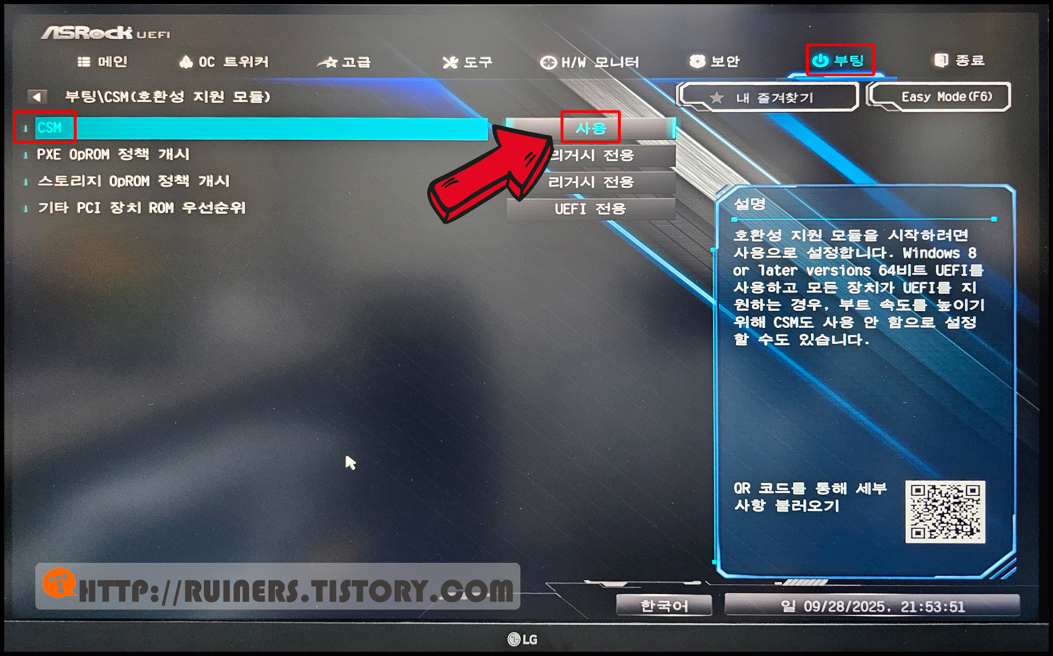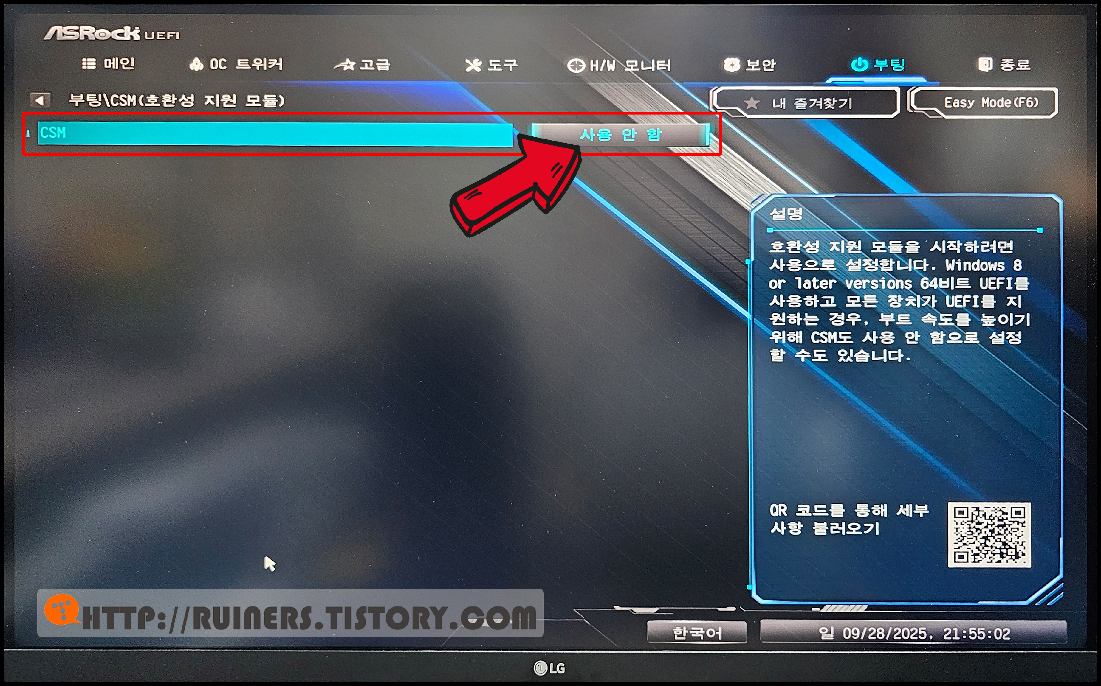 바이오스에서도 변경해줘야 할 부분들이 있기 때문에,