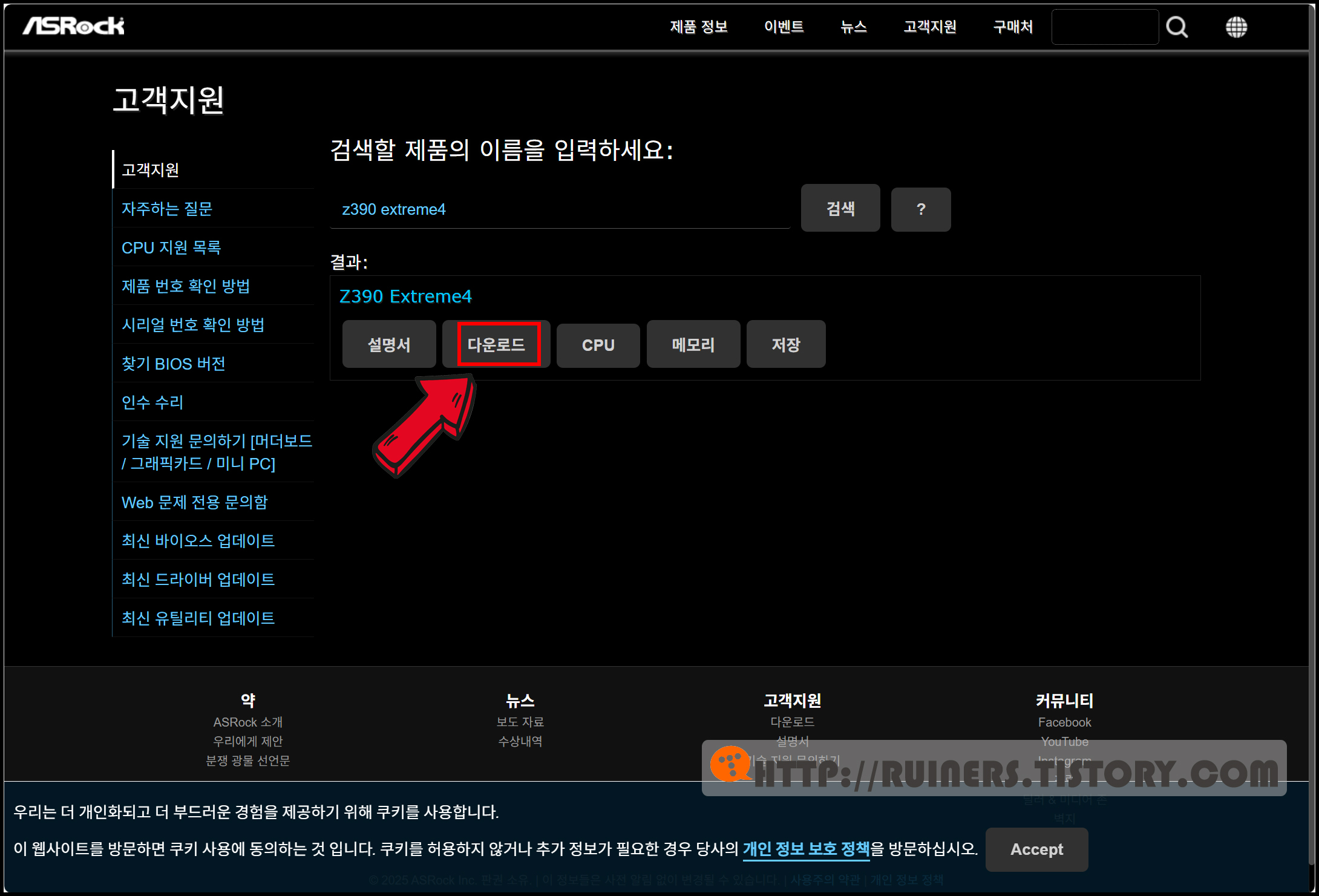 이번에는 메인보드를 특정 지었기 때문에, ASRock 홈페이지로 안내하겠습니다.
