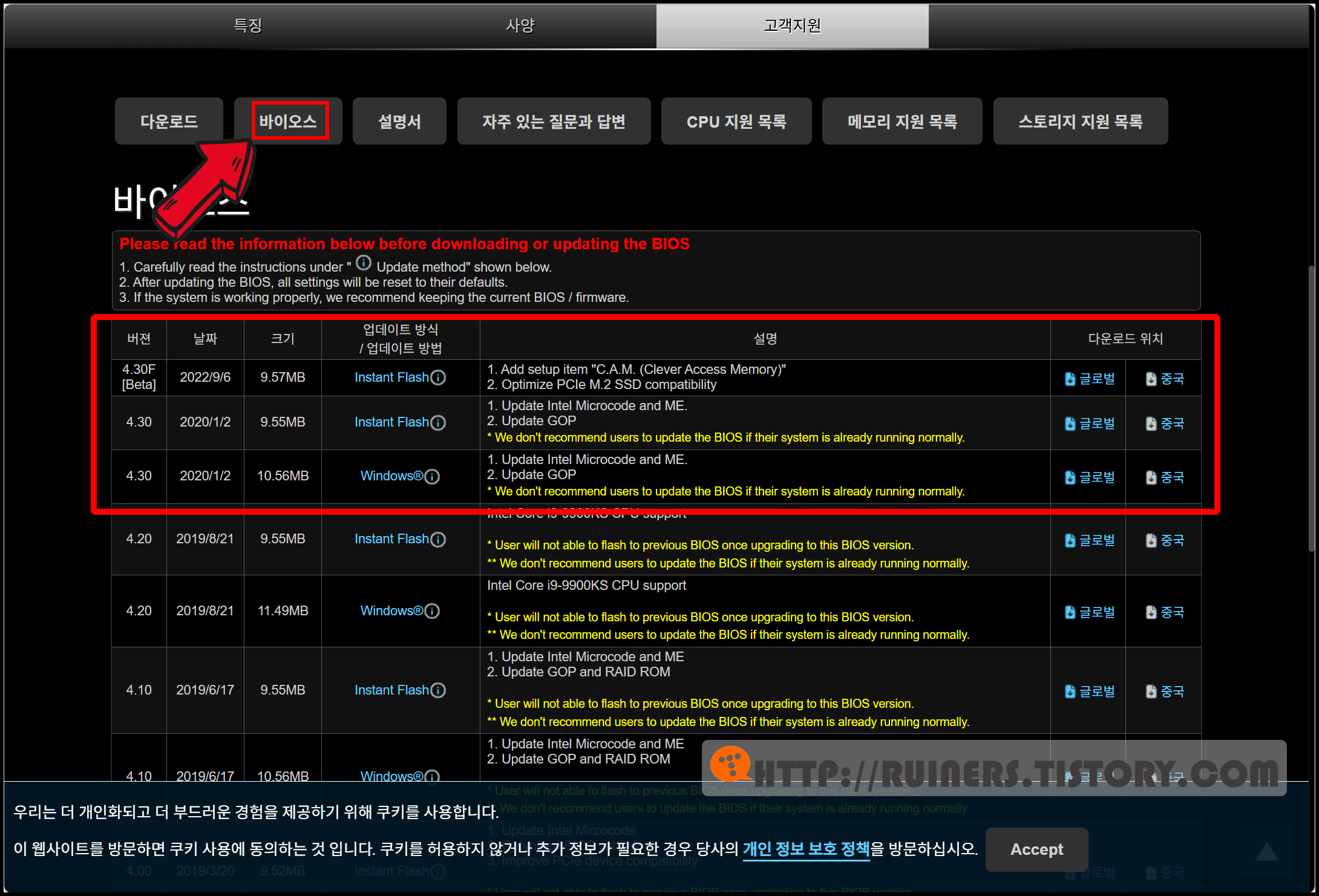 위 사진 순서대로 이동 후, 최신 Bios 파일 다운 및 업데이트 진행을 진행해주세요.