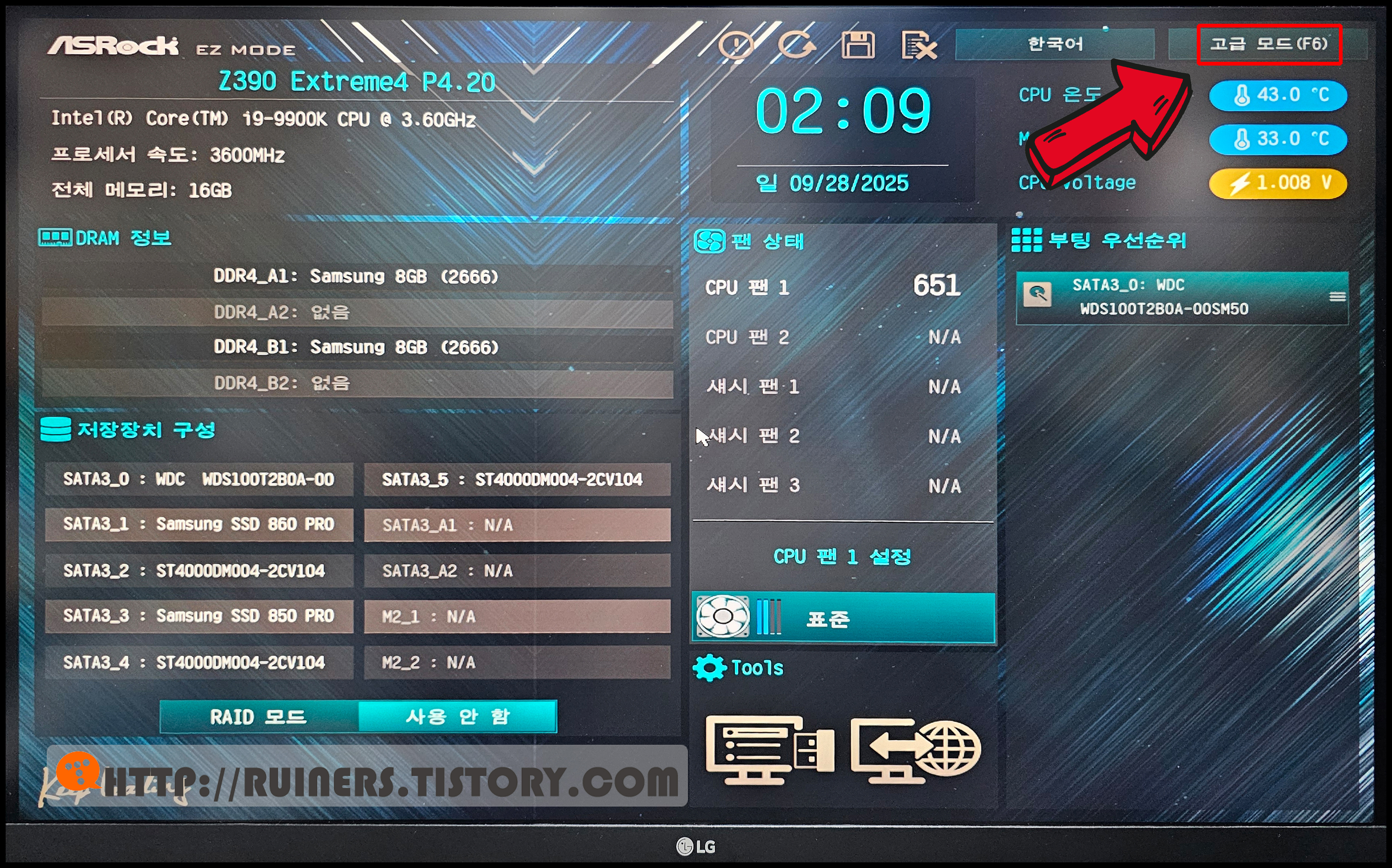 제 경우, 평소 바이오스를 EZ MODE 로 하고 있어, 고급 모드로 진입합니다.