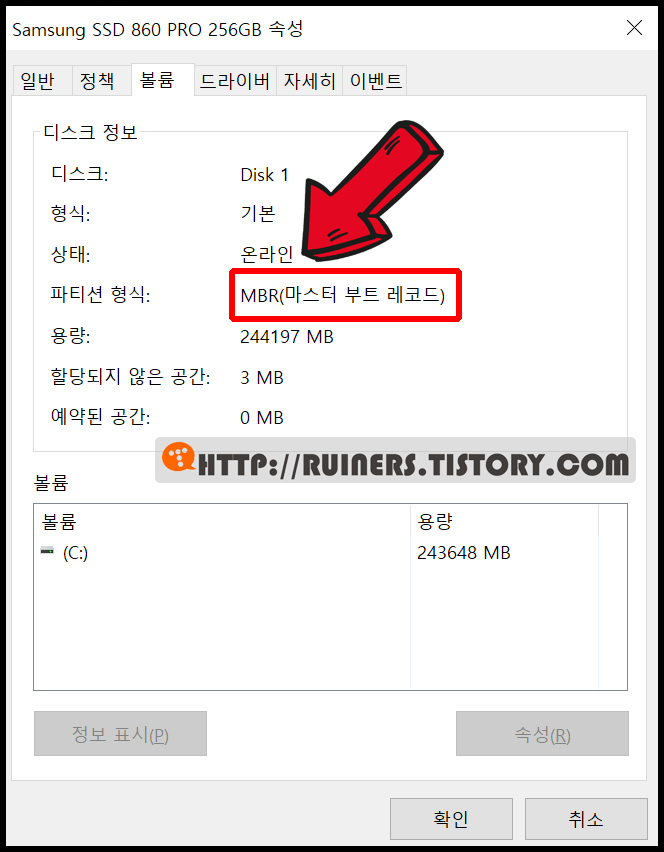 제 경우, "파티션 형식 = MBR (마스터 부트 레코드)" 상태 였습니다.