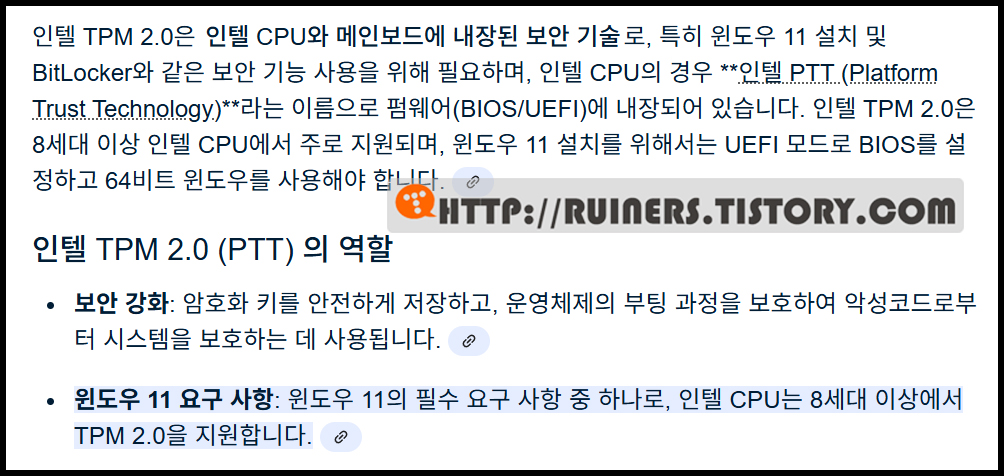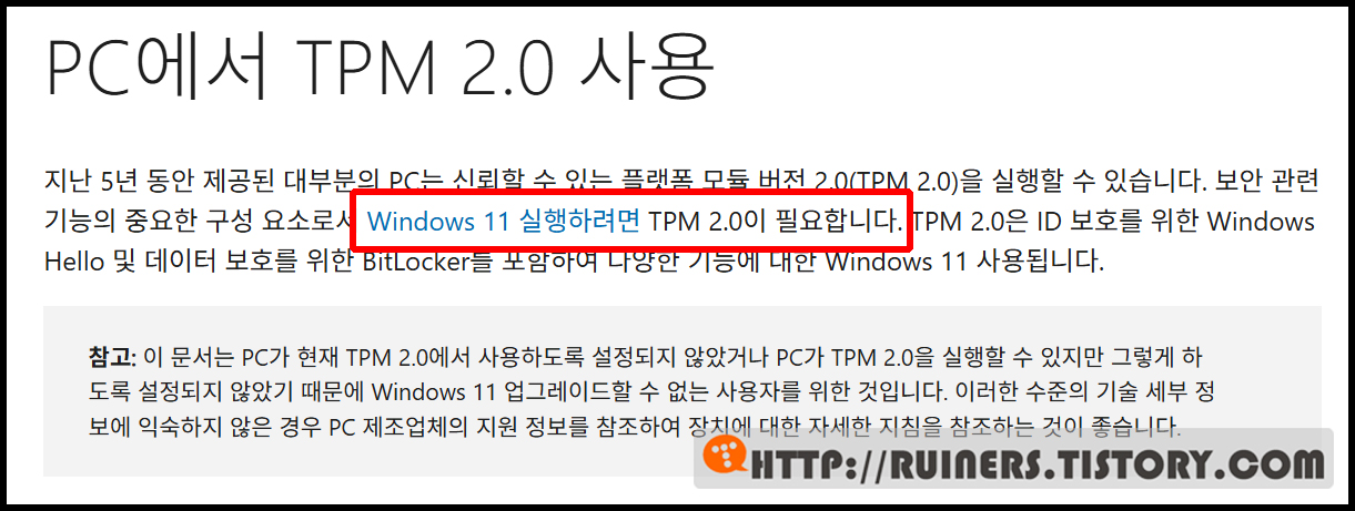위 사진과 같이 "Windosw 11 실행시 TPM 2.0 지원" 이라고, 명시 되어 있습니다.